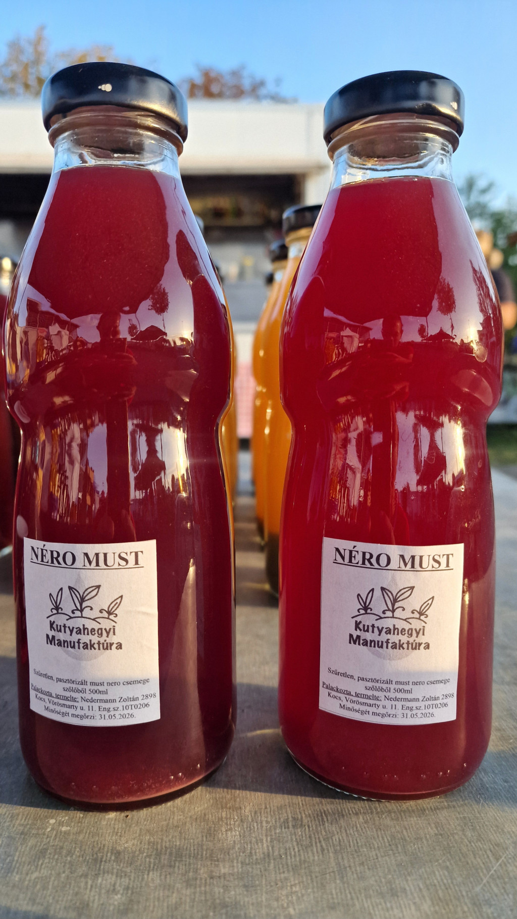Saját termesztésű néro csemegeszőlőből készített must    500ml   Pasztőrözéssel tartósított. Hozzáadott adalékanyagot és tartósítószert nem tartalmaz    Felbontás után hűtve tárolandó és 2 napon belül el kell fogyasztani.