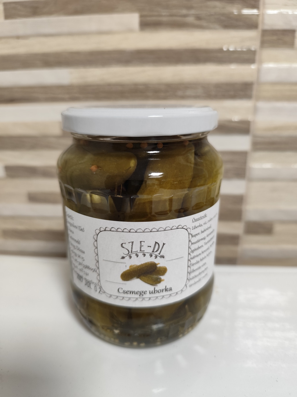Csemege uborka 720 ml Összetevők: uborka, víz, cukor, ecet,só,kapor, babérlevél, mustármag, koriander,egészbors.Tartósítószer: nátrium benzoát,borkén. Tárolás hüvös helyen, felbontás után hűtőszekrényben!