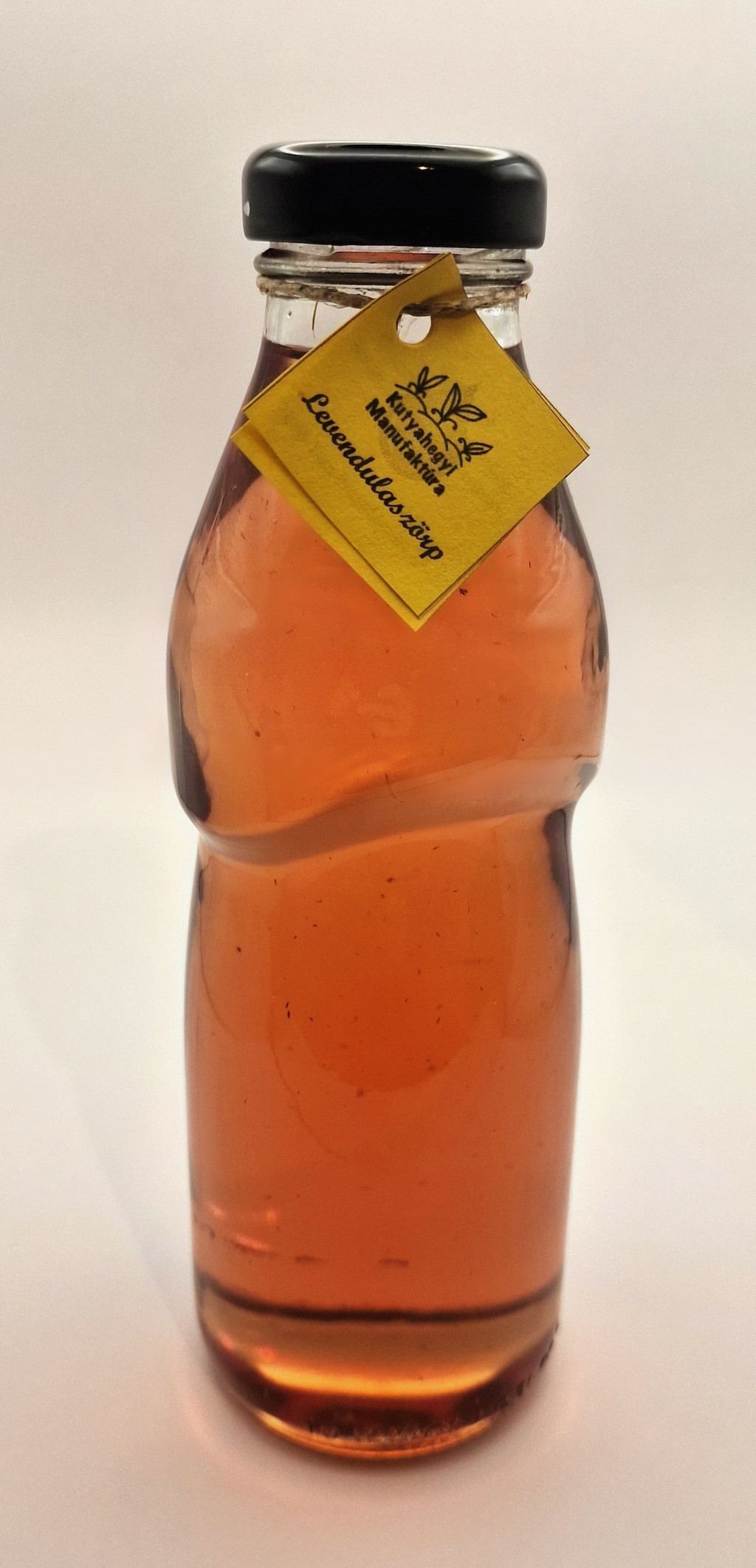 Levendulavirágból készült, adalékmentes, csökkentett cukortartalmú, 1:5 arányban higítható szörp.500ml Visszaváltható üveg 100.-Ft. Szárm.: Pest-megye,GYMS.m. Alapanyag: magyar őstermelői term. Term.módja: őstermelői gazd. Feldolg.: elsődleges, kézműv.term. Csomagolás: üveg,