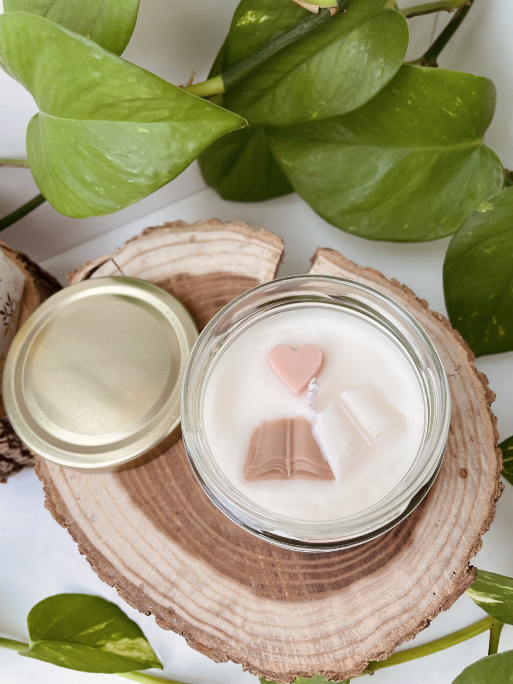 A Könyvölelésben gyertát elsősorban a könyvek szerelmeseinek álmodtam meg. Finoman bársonyos Lélekpulcsi illatunkat adtam neki - mely olyan, mint egy puha, gyengéd ölelés a léleknek, vagy épp a legpuhább takaró, mely alatt öröm elveszni a sorok között. :) Szép könyves, szívecskés viaszdíszt kapott és aranyszínű tetőt. Tökéletes ajándéknak is a soron következő különleges napokra - vagy akár csak úgy :) // Ez egy környezetbarát illatgyertya, 9x6 cm-es, körülbelül 200 ml-es üvegben. Tiszta és károsanyagmentes, prémium minőségű alapanyagokból, a hagyományos gyertyáknál 2x olyan hosszú égési idővel! Természetesen, mint minden gyertyánk, ez is kézzel készül (így nincs is két teljesen ugyanolyan darab), megspékelve sok szeretettel és csupa környezetbarát hozzávalóval! A tégelyét kiürülés után ennek is örömmel újratöltöm! :)