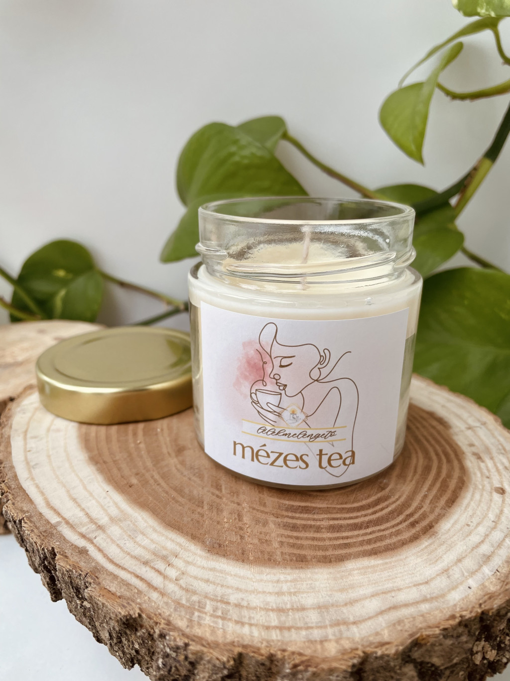A Mézes tea gyertya tökéletes azoknak, akik szeretik a méz és egy testet-lelket átmelengető forró gyümölcstea illatát. Különleges design címkét kapott és aranyszínű tetőt. Tökéletes ajándéknak is a soron következő különleges napokra - vagy akár csak úgy :) // Ez egy környezetbarát illatgyertya, 7x8 cm-es, körülbelül 200 ml-es üvegben, akár 30 órányi égési idővel. Tiszta és károsanyagmentes, prémium minőségű alapanyagokból, a hagyományos gyertyáknál 2x olyan hosszú égési idővel! Természetesen, mint minden gyertyánk, ez is kézzel készül (így nincs is két teljesen ugyanolyan darab), megspékelve sok szeretettel és csupa környezetbarát hozzávalóval! A tégelyét kiürülés után ennek is örömmel újratöltöm! :)