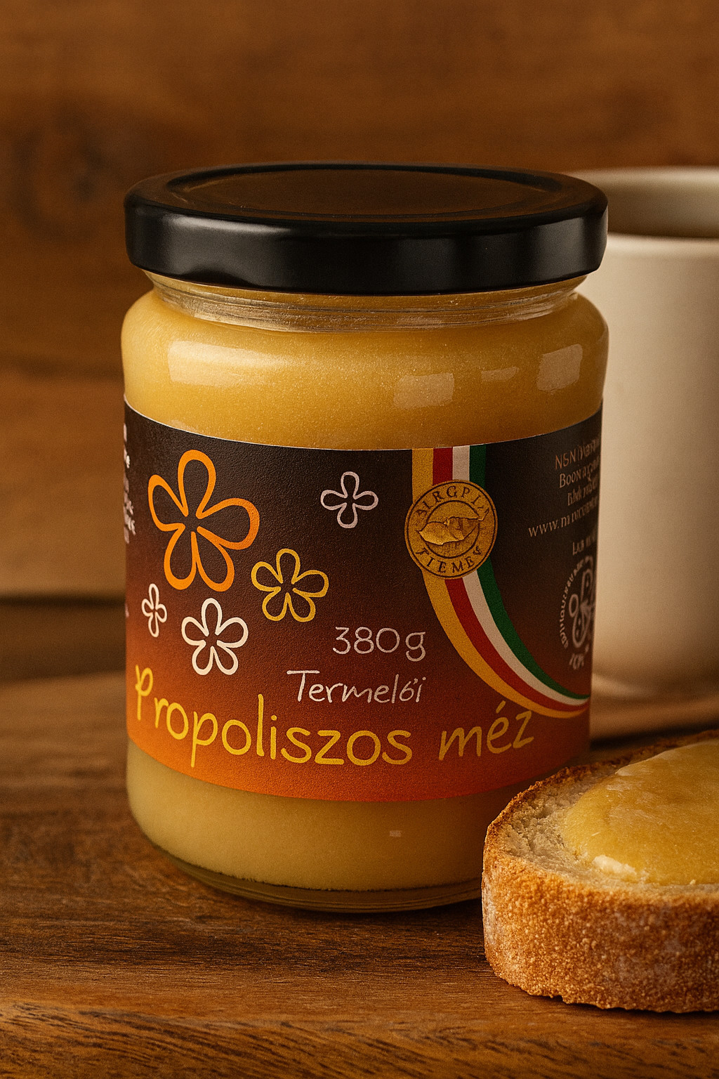 A propoliszos méz a természet erejét egyesíti egyetlen prémium termékben. A finom, zamatos méz és a méhek által gyűjtött propolisz kombinációja intenzív, enyhén gyantás ízvilágot és kimagasló hatóanyag-tartalmat eredményez. Miért különleges? • Természetes immunerősítő • Antibakteriális és gyulladáscsökkentő hatás • Magas antioxidáns-tartalom • Támogatja a torok, a szájüreg és a légutak egészségét Felhasználás: Napi 1 teáskanál közvetlenül, vagy langyos italokba keverve. Torokfájás esetén lassan elszopogatva különösen hatékony. Ízvilág: Édes méz alap, enyhén fanyar, gyógynövényes, jellegzetes propoliszos aromával. Fogyaszd rebdszeresen a mindennapi megelőzésért! Apró odafigyeléssel is sokat tehetsz az egészségedért