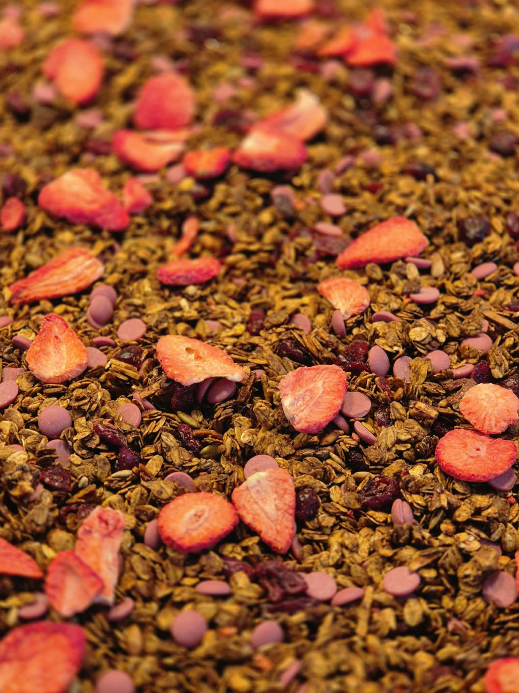 Zabpehely, tökmag, napraforgómag, lenmag, mandula, kókuszzsír, méz, nádcukor, aszalt áfonya, Ruby csokoládé, liofilizált eper, kakaópor, fahéj, só