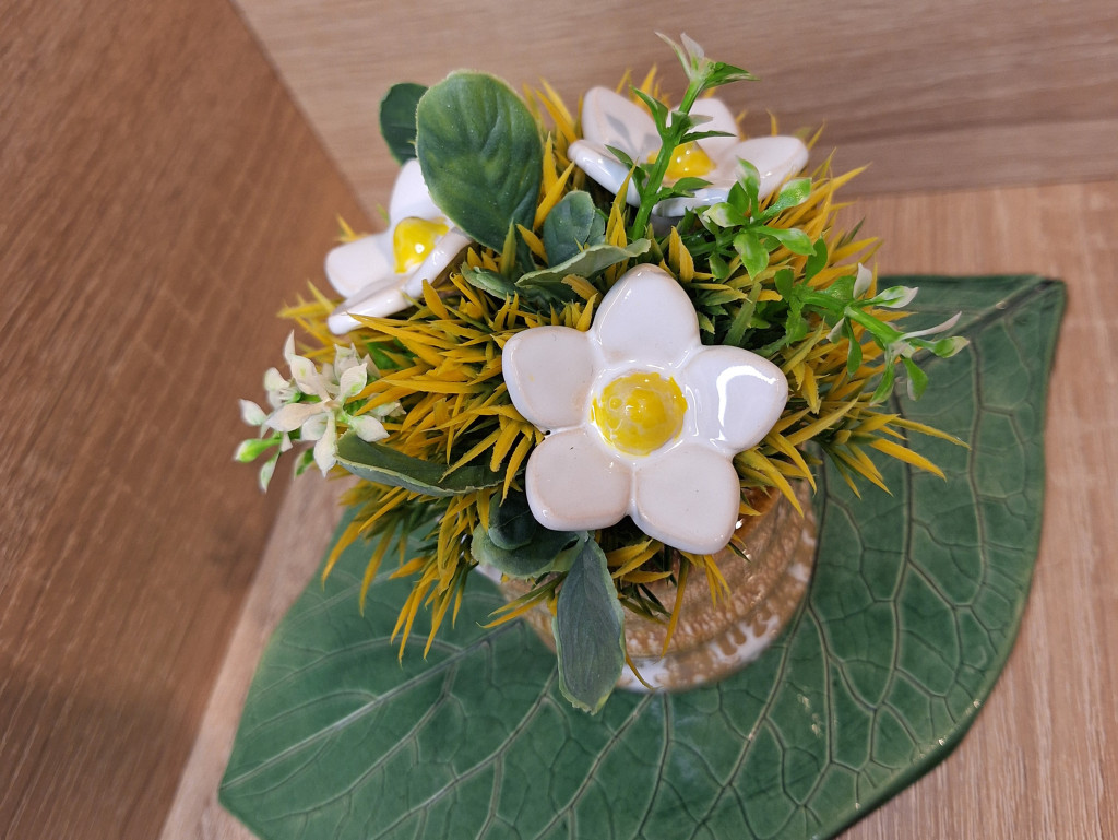 Mázazott kerámia kaspók és virágok, kitöltésre zöld műnövényt használtunk.