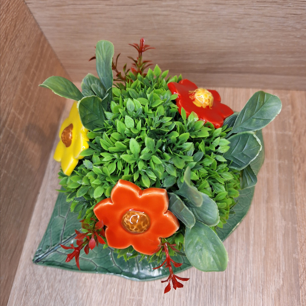 Mázazott kerámia kaspók és virágok, kitöltésre zöld műnövényt használtunk.