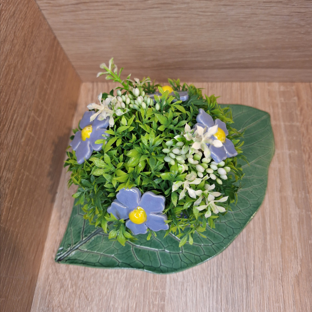Mázazott kerámia kaspók és virágok, kitöltésre zöld műnövényt használtunk.