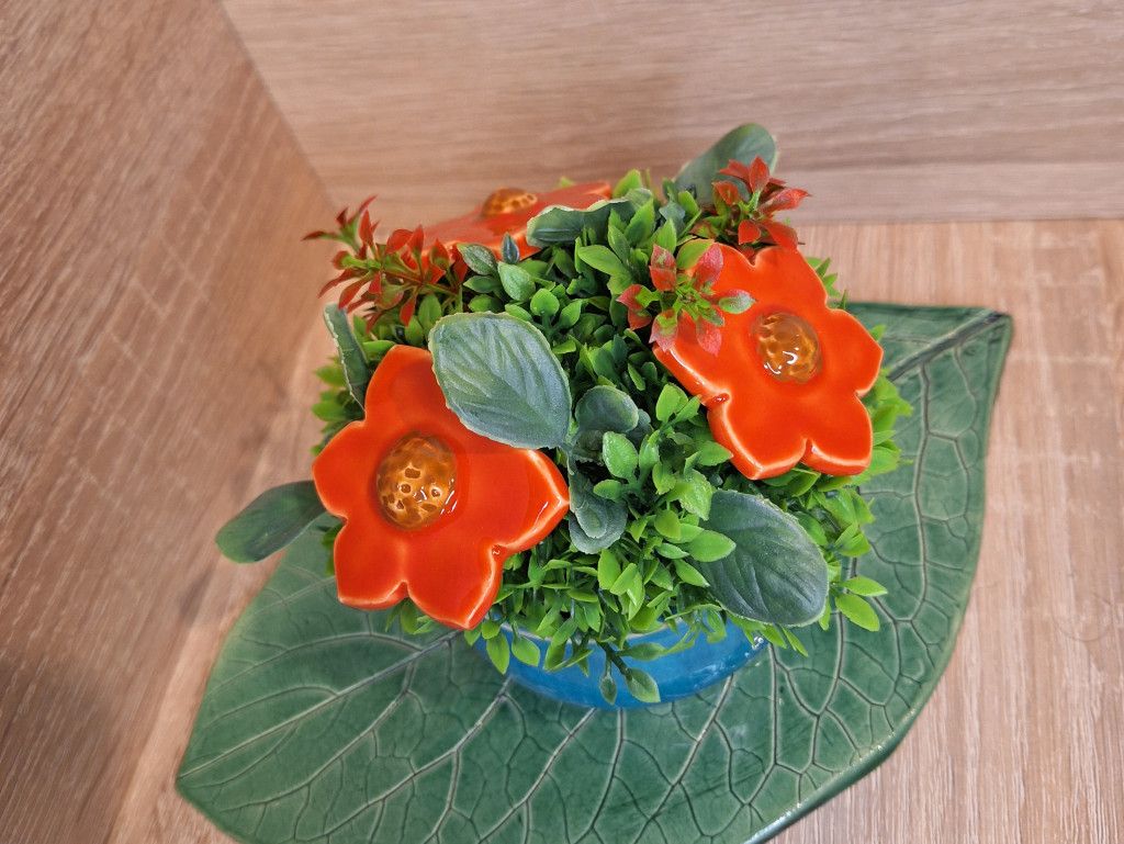 Mázazott kerámia kaspók és virágok, kitöltésre zöld műnövényt használtunk.